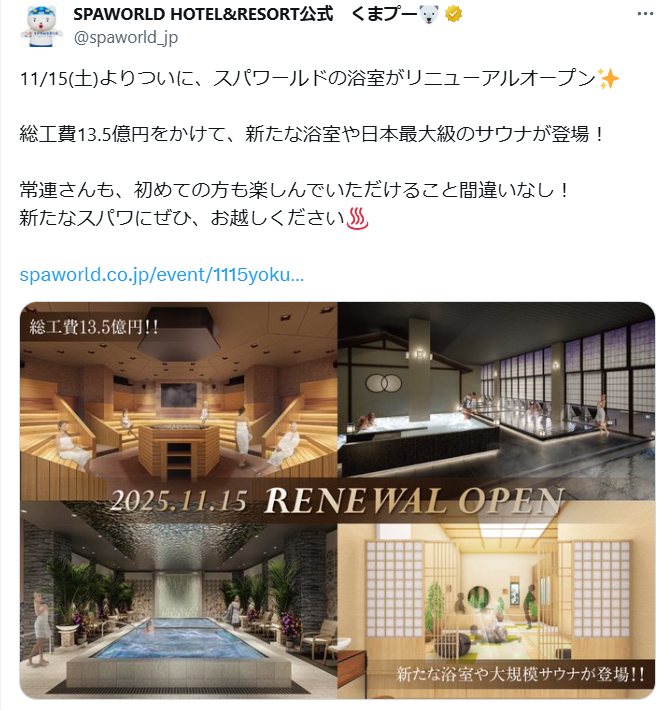 そして本当に偶然なのですが、イベントが開催された11月15日はちょうどリニューアルオープンの日でした。140名収容可能なサウナシアターをはじめ、様々な浴室やサウナが新設されています。